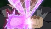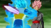 In the anime, Black first revealed Super Saiyan Rosé in his battle against Vegeta, Goku, and Future Trunks. Black was assaulted by Vegeta as a Super Saiyan Blue and withstood his vicious assault before ultimately impaling him through the chest with his energy blade. He then fought against Goku when he transformed into a Super Saiyan Blue; Goku was able to hold his own, but Black used his energy blade to pressure Goku. Once his ally Future Zamasu held down Goku and Trunks long enough, Black was able to take them both down with a single blast of the Super Black Kamehameha, which the Saiyans barely survived. In the Super manga, Goku Black attains this form by combining his divine power and his regular Super Saiyan form into it: by powering up massively due to recovering (and having Future Zamasu heal the damage) from a near-death experience, Goku Black's ordinary Super Saiyan form powered up and then evolved into the Super Saiyan Rosé.