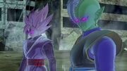 Super Saiyan Rosé Goku Black using Supervillain Power! alongside Future Zamasu in Xenoverse 2